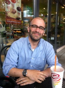 * A note about image-making: I’m not good at taking pictures, as I’ve discussed. For the first few legs of my tour, I had no camera with me and packed an ancient cell phone that could barely carry a signal, let along snap great shots. I regretted this at many points: Silver Lake was so pretty, and I so wanted to have a picture of Brenna and her charming home, for example. There was my book in the window of Prairie Lights Bookstore. And there I was in the freaking Hollywood Hustler! Finally, in Seattle, with the stupendous Josh Feit leading the way, I biked to the U-district to buy an iphone, thus removing any excuse I had not to document my adventures more thoroughly. I immediately took a picture of Josh at the Jamba Juice next to the Apple store.
